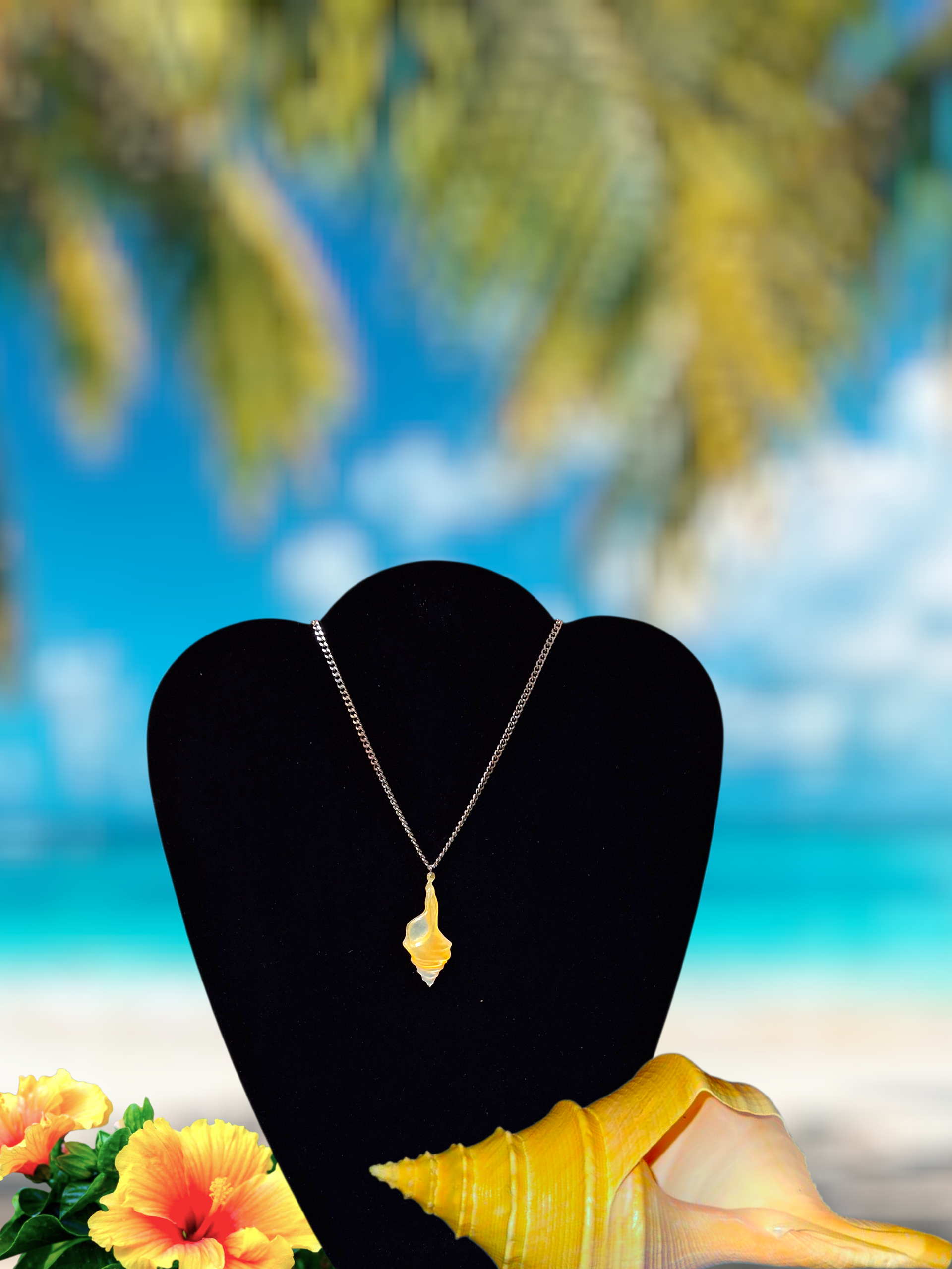 This unique pendant highlights the trumpet shell.